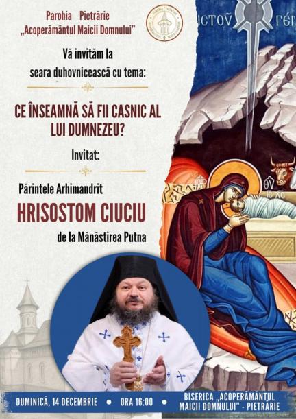 Biserica „Acoperământul Maicii Domnului” – Pietrărie, Protopopiatul 3 Iași, organizează, de la ora 16.00, o seară duhovnicească, în cadrul căreia părintele arhimandrit Hrisostom Ciuciu de la Mănăstirea Putna va susține conferința cu tema: „Ce înseamnă să fii casnic al lui Dumnezeu?”.